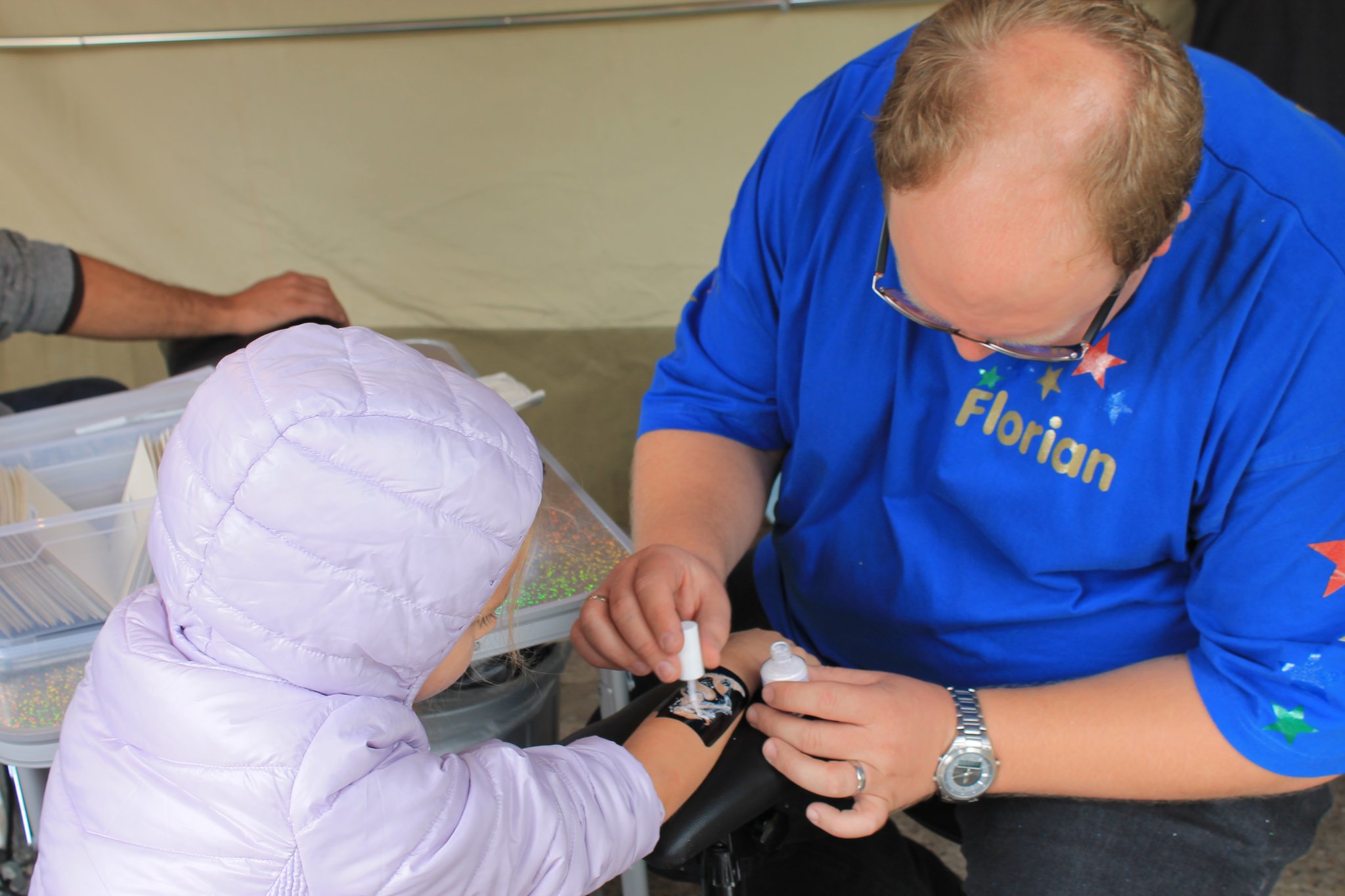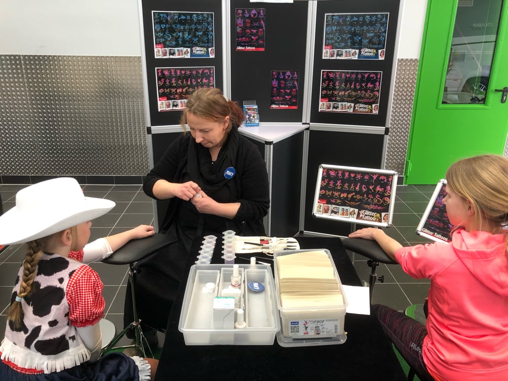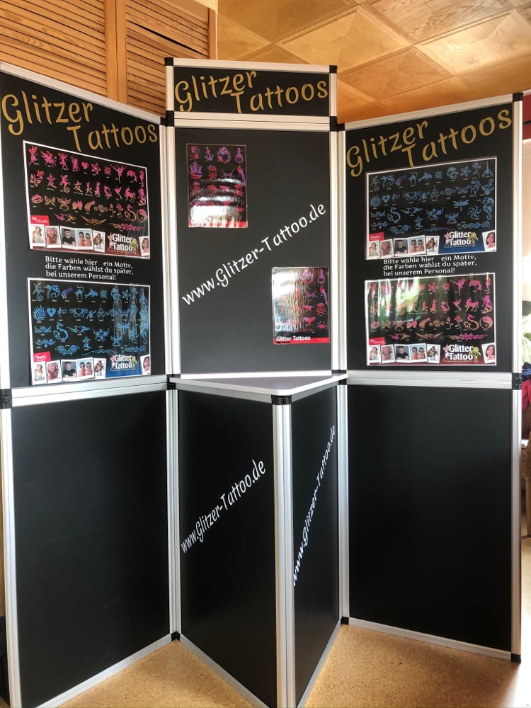 Wir kommen mit unserem Glitzer Tattoo Stand gerne zu Ihnen, dafür benötigen wir eine Standfläche von ca. 3x4 Metern.